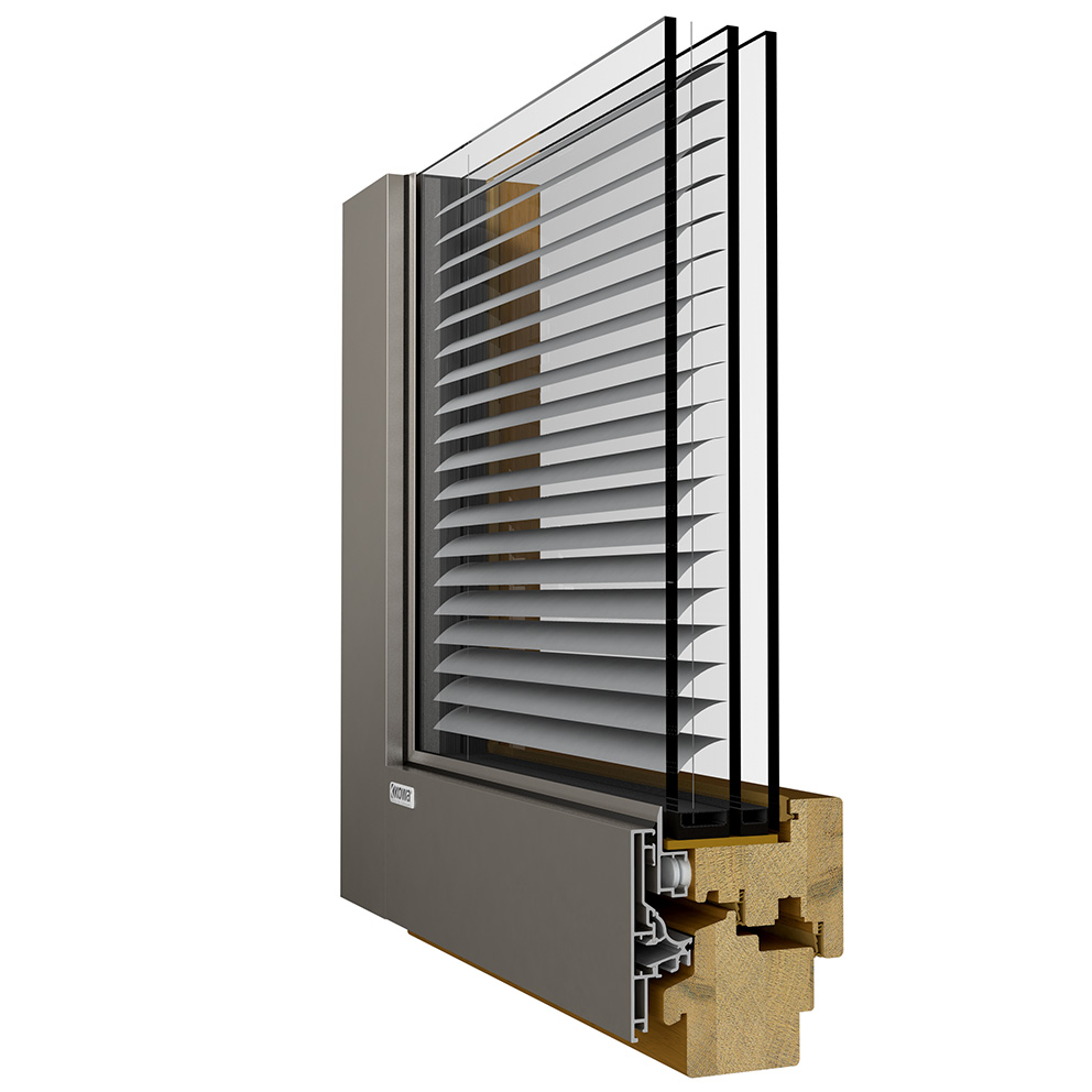 Die markanten Holzprofile unterstreichen nicht nur die architektonische Klarheit, sondern setzen auch ein starkes gestalterisches Statement. Wer auf Sicht- und Sonnenschutz nicht verzichten möchte, kann optional eine im Scheibenzwischenraum integrierte Jalousie wählen – komfortabel, wartungsfrei und optisch perfekt eingebettet.