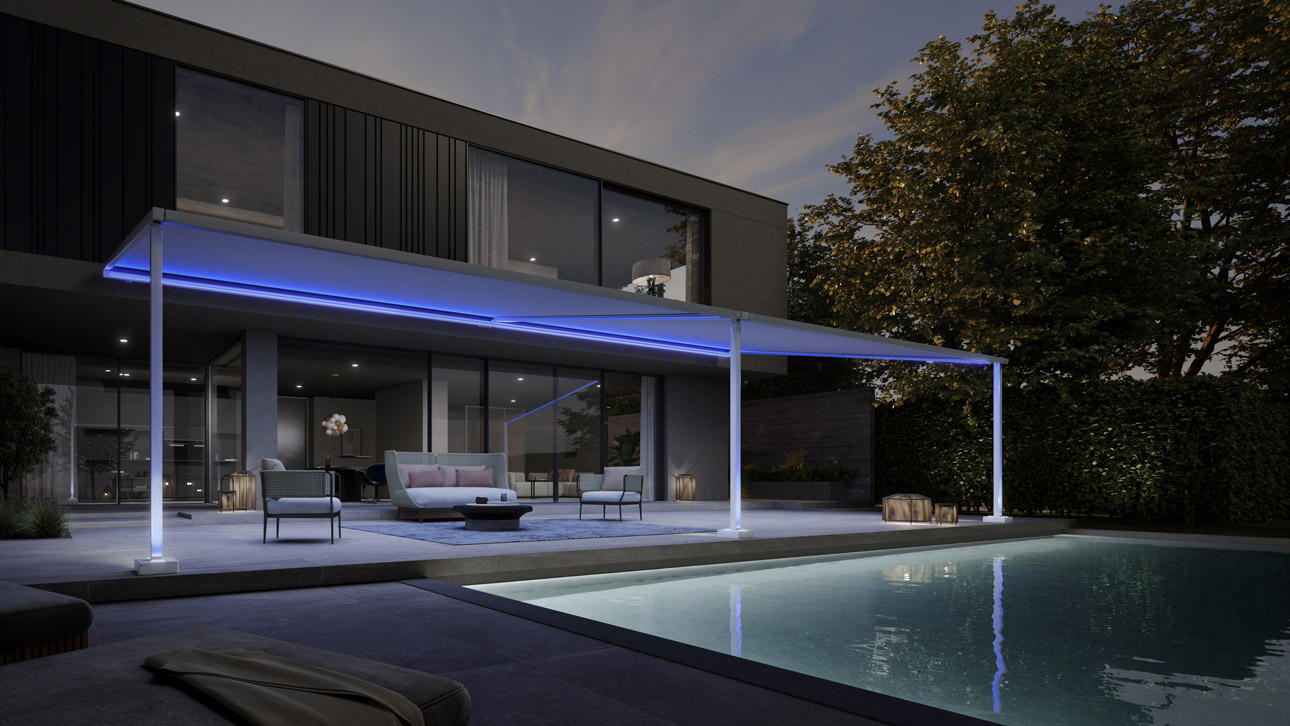 Die eleganten Säulen lassen sich seitlich absenken um einen besseren Regenwasserablauf zu gewährleisen. Mit der Option Schattenplus ausgestattet bietet die markilux pergola außerdem optimalen Schutz auch bei seitlich einfallendem Sonnenlicht. Statten Sie Ihre Pergolamarkise zusätzlich mit LED-Leisten für eine einzigartige Atmosphäre auf Ihrer Terrasse aus.